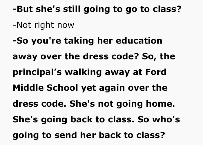 “So, the principal’s walking away at Ford Middle School yet again over the dress code,” the mother adds.