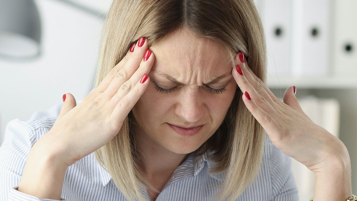 Frustrated woman with blonde hair holding temples, depicting stress over racist MIL and family tension with hubby.