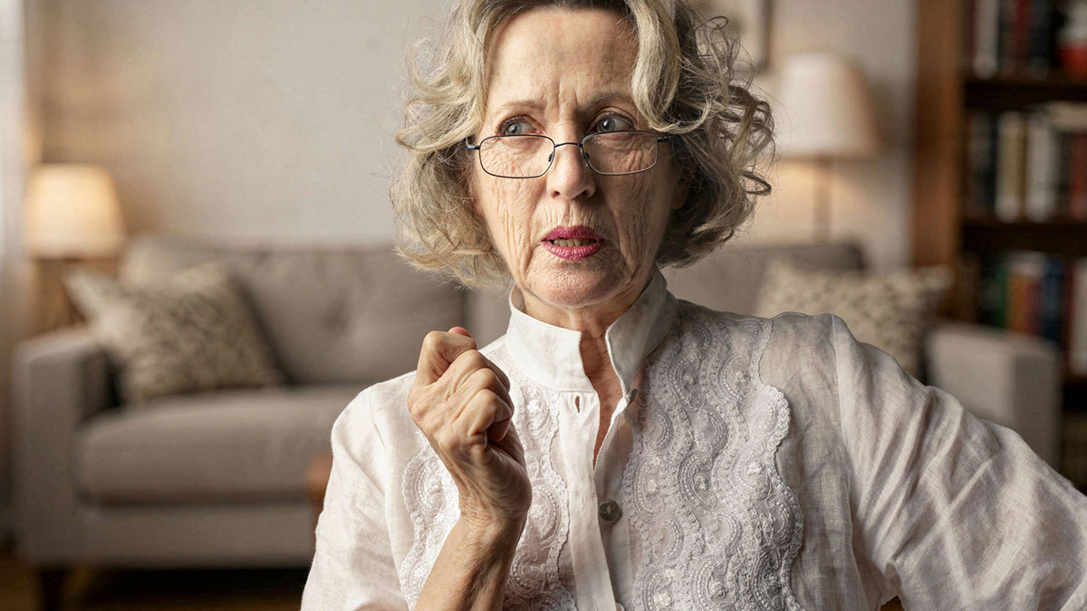 Older woman wearing glasses in a living room, looking concerned and serious, related to mil refuse baby name issue.