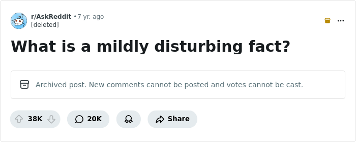 So what happens when someone online asks, “What is a mildly disturbing fact?” From creepy discoveries to bizarre tidbits of knowledge, this thread shows that some facts can make you squirm, shiver, or think twice. These unsettling truths reveal how strange and sometimes alarming the world can be. Keep reading to see the most surprising and slightly disturbing facts people have shared!