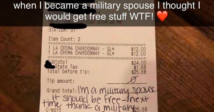 That said, this has to be one of the biggest stretches someone has made for a reason as to why they think they’re above having to tip. Someone posted this picture of a receipt on which one such customer voiced her frustrations, complete with the favorite emoticon of passive-aggressive note-writers everywhere, =), that she didn’t get her entire bill comped as thanks for doing “the toughest job in the military”: being a military spouse.