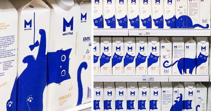 Russian art director Vera Zvereva is the one responsible for this adorable cat-inspired design which landed on the packaging of four milk products of Bryansk Dairy Plant’sМилград (Milgrad) product line. And, as it seems, people have been loving this new design quite a bit.