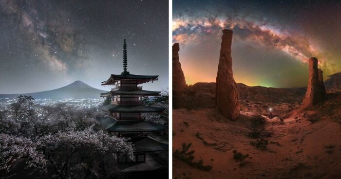 "Mount Fuji, Japan’s iconic symbol, dominates the backdrop of this image, set during cherry blossom season. Amidst the landscape, you can see a sacred temple dedicated to honoring the spirits of the departed. And there, against the dark canvas of the night sky, the ethereal beauty of the Milky Way came into view."