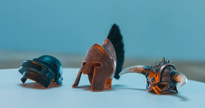 The first is the classical Greek Spartan helmet on top of a brush hair. Hair is made of an old painting brush.