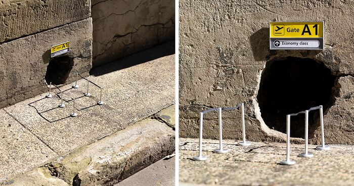 His work is simple and clever. A gap in a wall becomes a tiny theater “for cockroaches,” and a hole in the pavement is turned into a miniature airport departure gate. These little surprises blend into the city and turn everyday spots into something fun and unexpected.