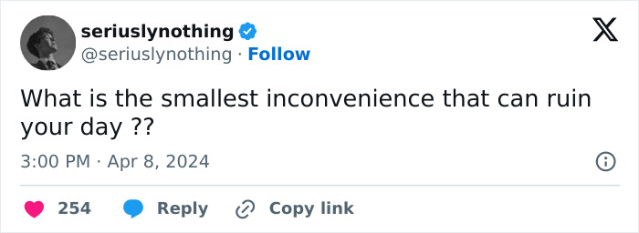 Recently, a post appeared on X (aka Twitter), that asked netizens what small inconvenience could ruin their day - and as of today, the tweet has over 11.3M views and a myriad of various small annoying things. Damn it, I didn’t even realize there were so many of them! So here's a selection of the most interesting points made by Bored Panda for you.