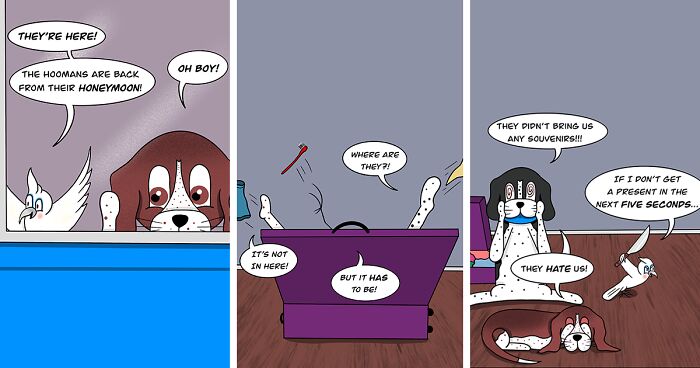 Even though the comic series is based around the specific everyday lives of our unique pets, I do try to keep the stories and messages relatable to others as much as possible. I would like to think a lot of the sSaveilly adventures we imagine for our pets are somewhat universal experiences for anyone with animals. I know we can’t be the only ones who enjoy making up ridiculous stories to ourselves about what our pets are thinking and doing, and so making a long-running comic series around the idea just felt like the natural next step. That’s also why I love using our own pets as the basis for my inspiration – since they’re always up to something ridiculous, you get a balance of story and punchline all in one!