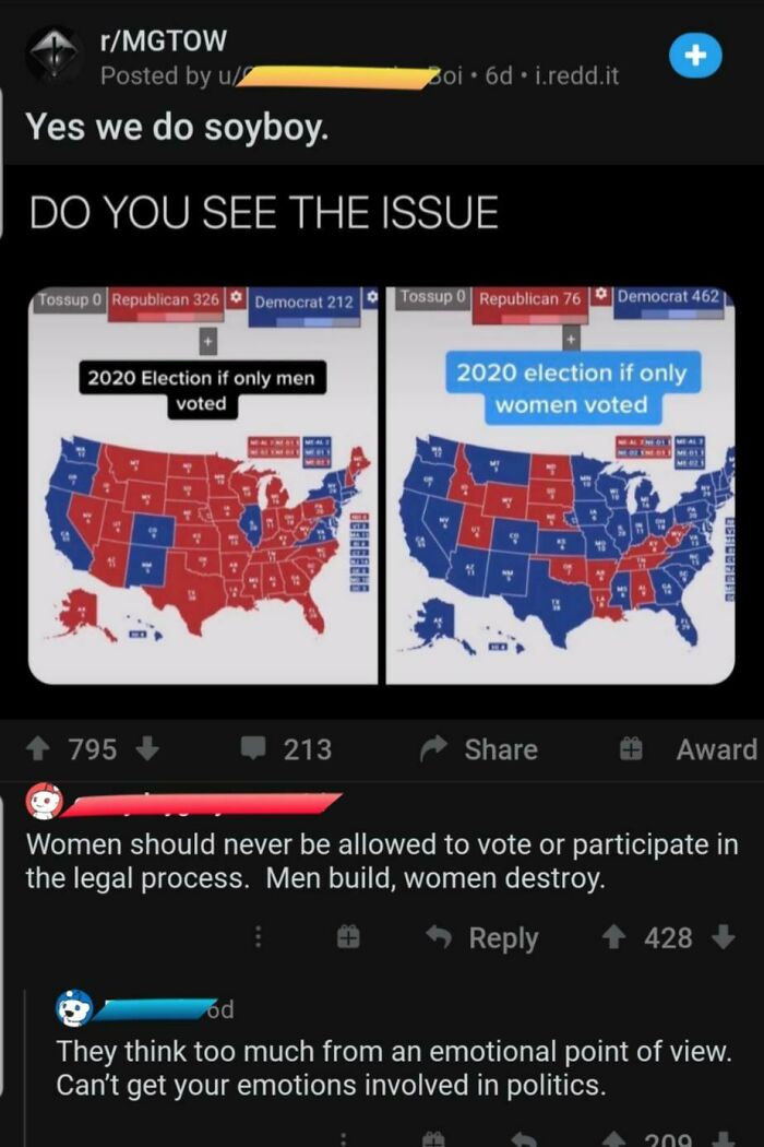 Femoid is one of the common derogatory terms, used among incels to dehumanize women. By using the compound of the words female humanoid, they portray girls as monstrous objects, this way trying to vindicate their hate and violence. According to them, women believe to be superior to others, which makes victimizing men one of the main recurring topics among the members.