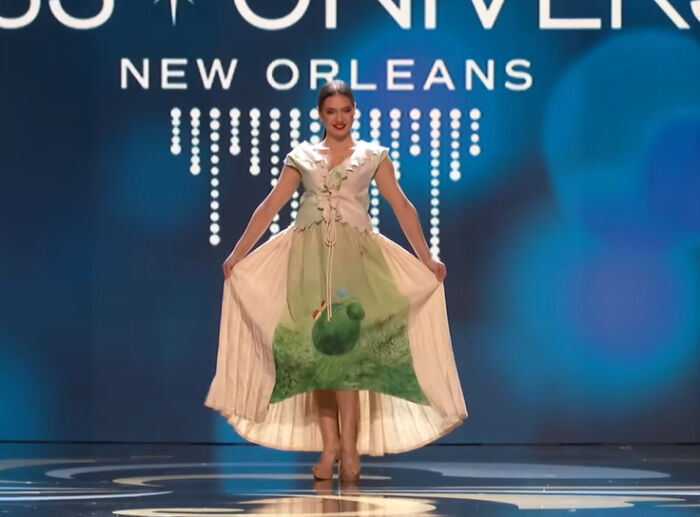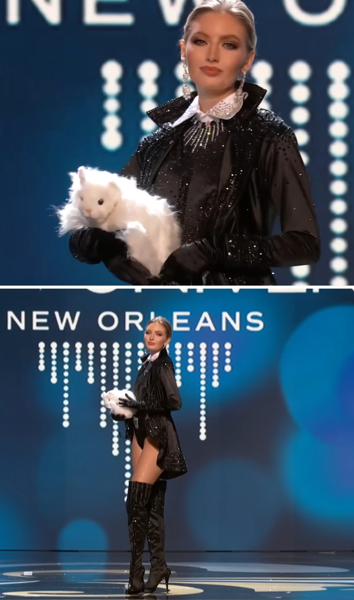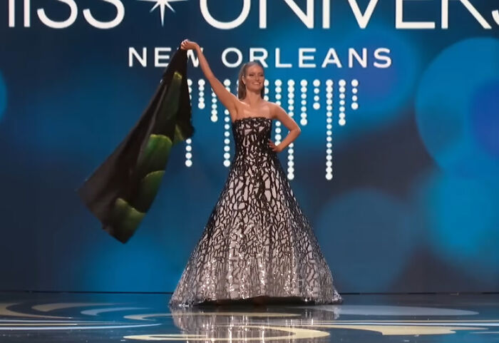 This national costume was inspired by German fashion designer Karl Lagerfeld. Chanel’s creative director was an advocate for animal rights just like this delegate. The piece recreates Lagerfeld’s look with an endless number of Swarovski crystals.