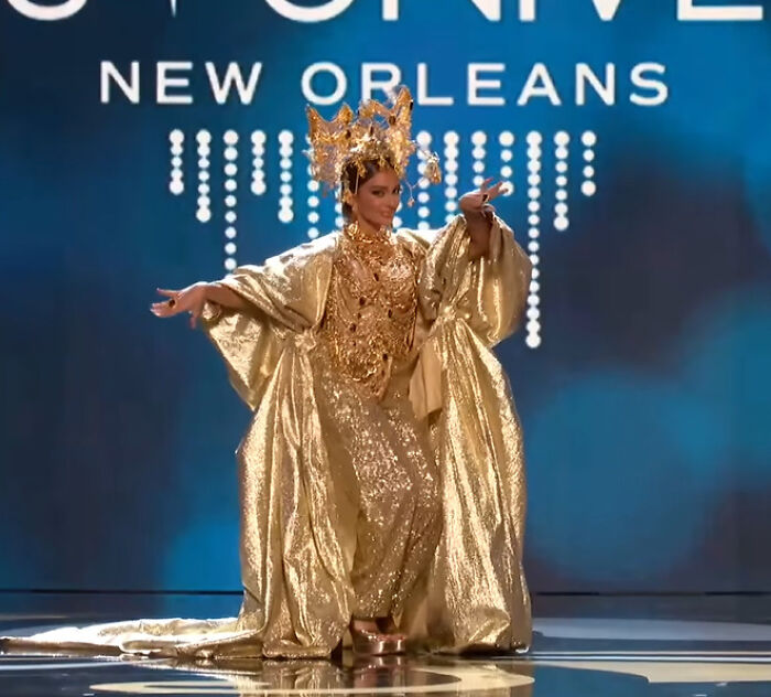 Inspired by her country in Central Africa, this costume’s baskets represent the nation’s agricultural movement. The necklace features Mount Cameroon, a volcano known as the mountain of the gods. The crown features her country map and flag colors.