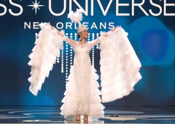 The white swan is a symbol of a pure and faithful love, so its image is used in the traditional bride costume. The designer felt an image of a gentle white swan emphasized this delegate’s inner beauty and peace.