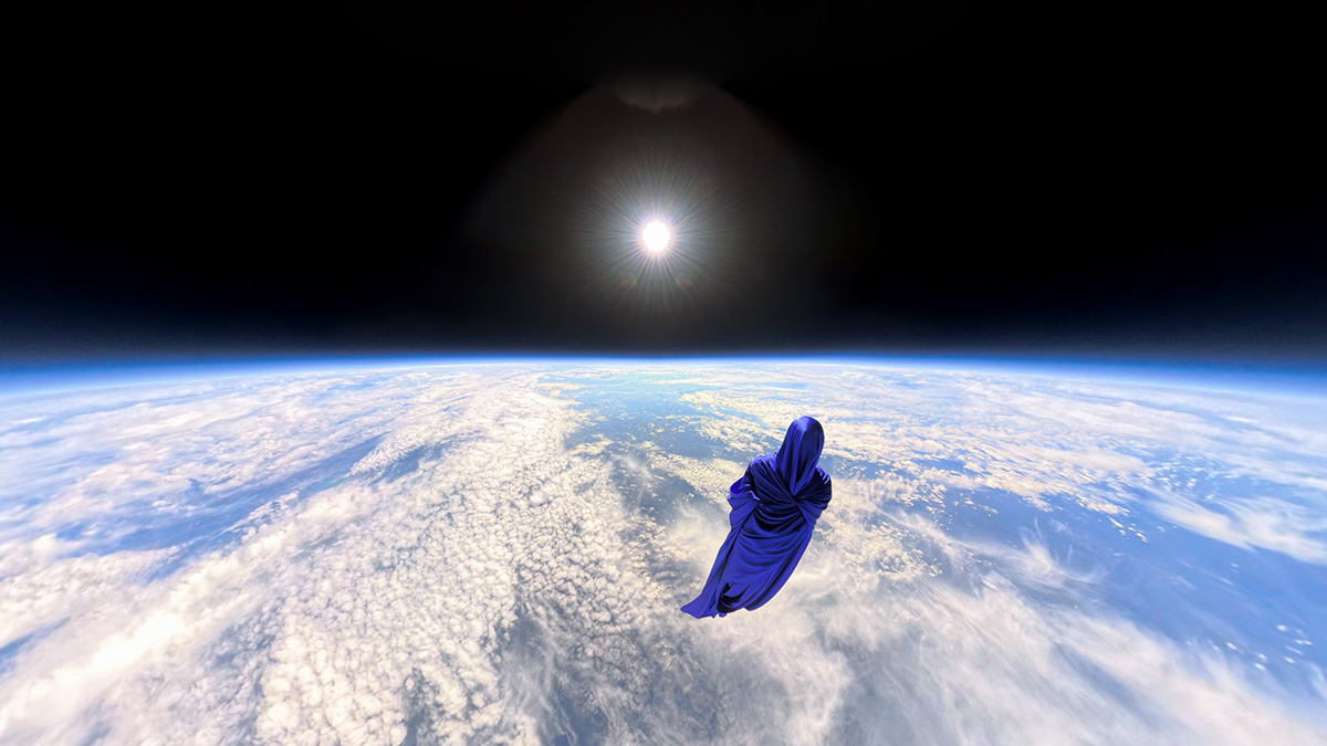 As described in the project, “by draping the body in silk… transforming the human body into a shared poetic experience.” Suspended above Earth, the figure lost individuality and became a universal form, placed in direct contrast with the scale of the planet and the surrounding void.