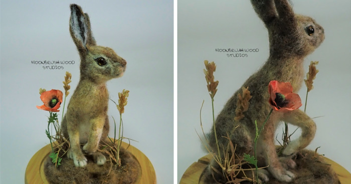 This hare miniature has been carefully felted from merino wool and placed in a wheat field scene. With hand-painted paper flowers and wheat crafted over many hours.