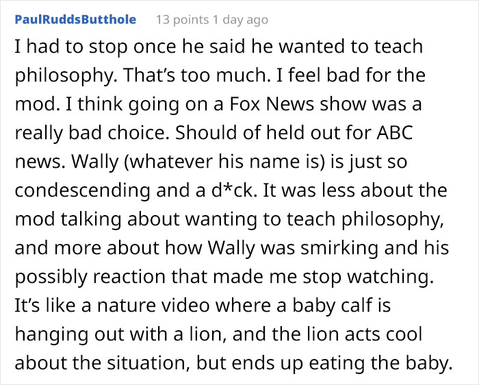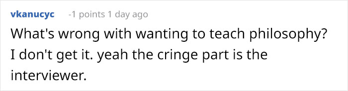 As the user found out from the interview, the moderator is “a dog walker who lives in their parent’s basement at 30 years old” and only works a few hours per week. “Their dream is to teach philosophy but they currently have no credentials to do so.”