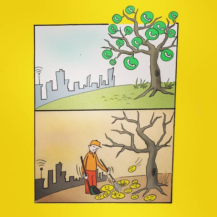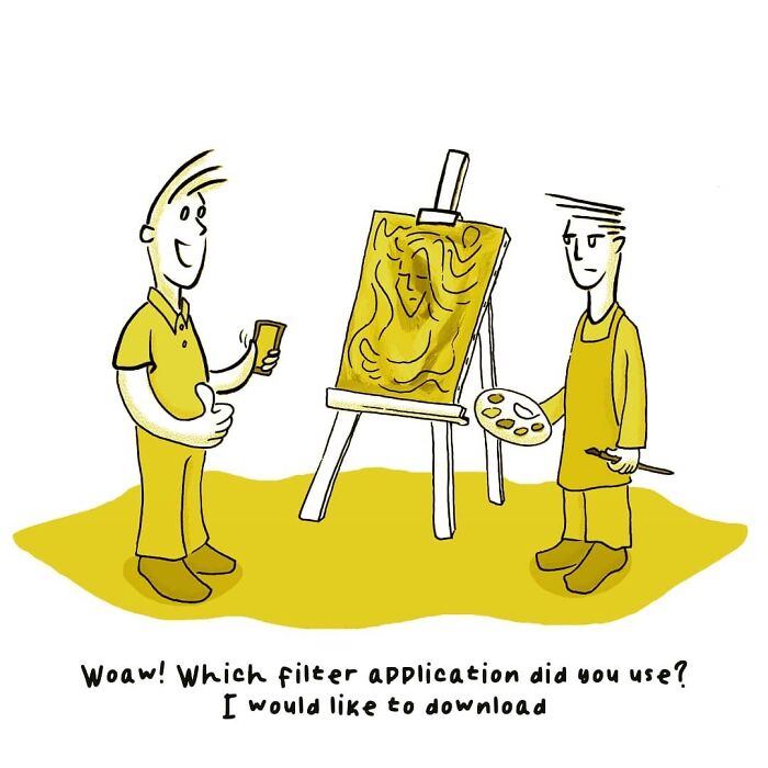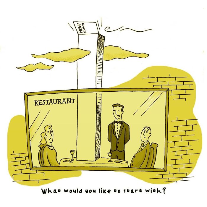 In 2018, I started sharing my cartoons on my Instagram blog called "Kartun Çizim." I prepared the cartoons I shared there in a yellow frame and yellow tones and integrated them. In my cartoons, I generally handle modern daily life in a minimalist linear style. Here, I present some of the cartoons I have drawn over the years. I hope you enjoy them!