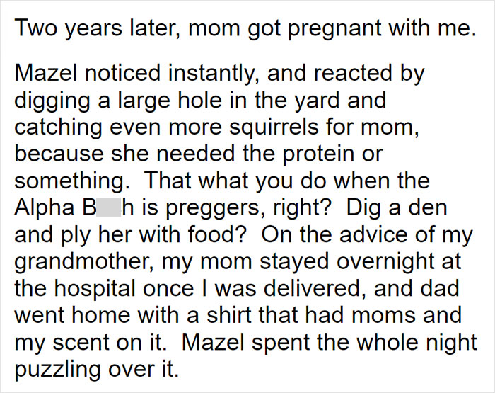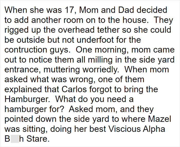 When Mazel was 17 years old, OP’s parents decided to make some repairs in the house, and the workers had to appease the wolfdog with hamburgers every day – until they saw how OP’s little sister easily handled that “terrible beast”.