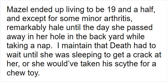 Mazel ended up living to the age of 19. As the OP notes herself, Death, just in case, decided to wait for her to fall asleep so that the wolfdog would not take away his scythe, mistaking it for a chewing toy…