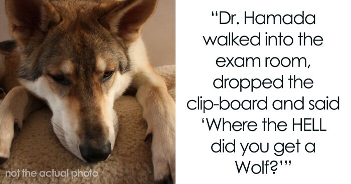 The vet, Dr. Hamada, walked into the waiting room, dropped his clipboard, and asked, “Where the hell did you get a wolf?”