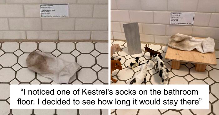 A week went by. Nothing. Campbell’s daughter still hadn’t picked up the sock. Realizing this could go on for a while, the mom developed a new idea: mimicking the type of label high-end art galleries use to present their pieces with, Xep put up the information for this piece as well, listing her daughter as the artist of the “mixed media” display, later sharing the picture on Facebook.