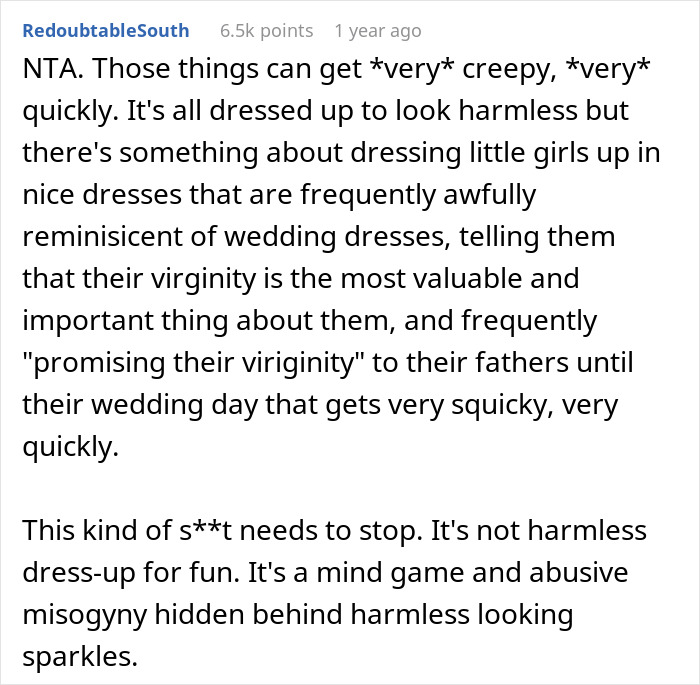Some said that the husband was to blame for supposedly hiding this bit of info, like OP had suspected. Others pointed fingers at the mother-in-law, suspecting that she’s alienating the daughter from the mother based on how MIL claimed OP’s a bad influence on her husband, who’s her son. This is besides the several people pointing out how creepy purity balls can be, let alone psychologically damaging.