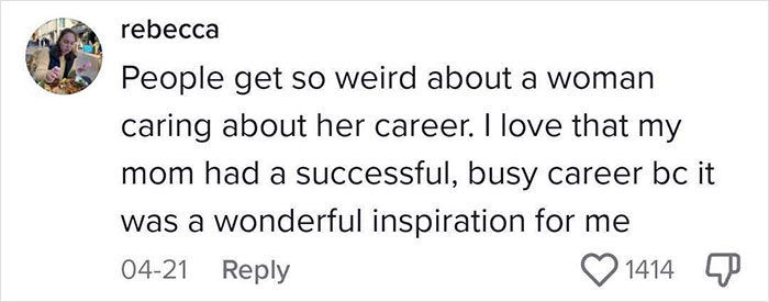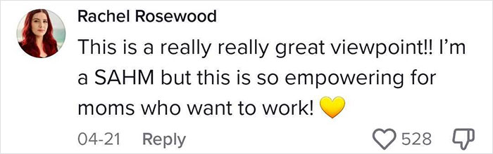Load More Replies...This is a situation that each couple, each woman must make for themselves. For us, we went through 16 years of infertility, testing, miscarriages and attempting adoption. At the end, I ended up getting spontaneously pregnant with no assistance from doctors, and had a healthy baby. I decided I didn't want to miss a single moment, so both of us decided that I would be a SAHM. Now, my son is 18 and I want to go back to the work force, but I've been out of it for 18 years and I'm 54 years old. Finding work will be difficult, and those jobs I'll be able to get will likely be unpleasant minimum wage jobs. But that was the choice I made. On the whole, women make an incredible amount of sacrifices when they become parents, and are usually judged for all of them.