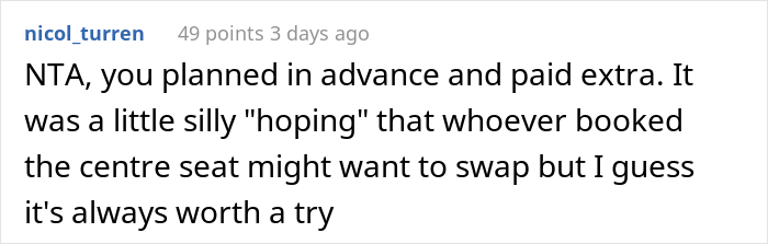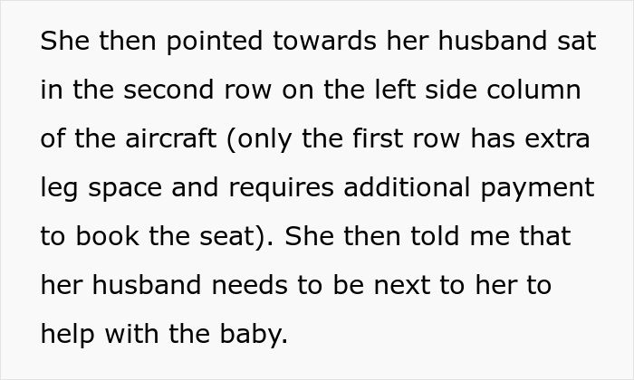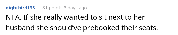 Load More Replies...I always book and pay extra for the seat I want. If someone wants specific seats, I suggest they do the same. I can't stand people who think having a baby means that their needs are more important. What if the person your asking to move has pain, an injury, anxiety etc (not that they need an excuse to refuse your request). I, and I believe many people, do make allowances for people with babies when we can but it's not owed to you.