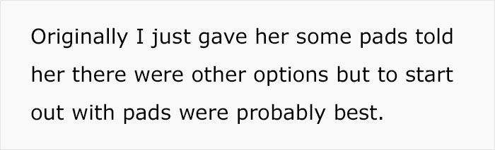 Load More Replies...I once had a girl at my house~a friend of my daughters and she got her period. We didn't use pads. Just didn't, never have. And I told her all I had was a tampon and she told me her mom told her if she used it, it caused cancer. I gently explain to her that wasn't true and offered to go get her the pads. But teaching your kids lies because you don't want them to use them is ridiculous.