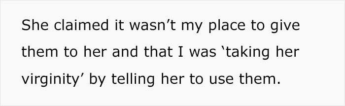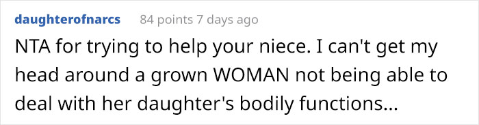 But after offering the girl tampons to use and resolving the issue, the mother was outraged. She claimed that the tampons would “take her virginity” and thought the aunt was out of line. Confused by what had just happened, she asked Reddit if she was in the wrong for doing what she thought was necessary for helping a young girl where her mother refused to.