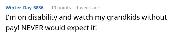 Load More Replies...This one seems weird all round. I think one of the first commenters might have hit the nail on the head. This might be the grandmas way of saying "you're just using me as a babysitter, so pay me like one". There is a difference between asking a grandparent to look after a kid and expecting them to. When she says "at most twice a week" makes me think it's actually pretty frequent and potentially interrupting stuff grandma wants to do. This is grandmas way of pushing back without explicitly saying "no I won't watch your kid all the time" hoping the Mum will reduce the amount of babysitting she wants as a result. Seems to me (like most problems on Reddit) this would be solved by the two sitting down and having a sensible conversation. "Do you really need me to pay you, or is this about something else? Am I imposing too much?"