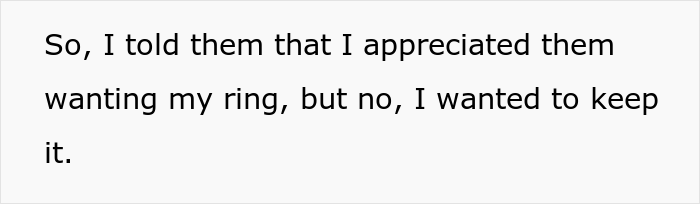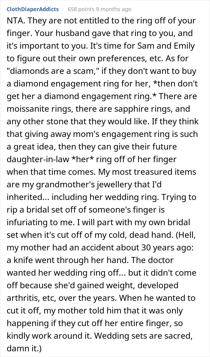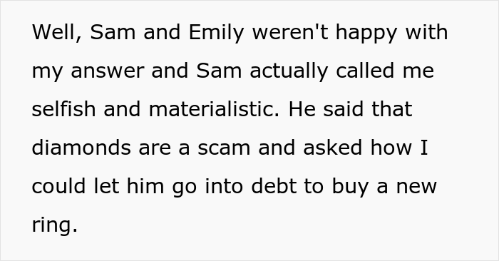 Load More Replies...Diamonds are a scam, but he wants yours? No, Sam and Emily are cheap but desperate to have a ring to post on social media. How could they even ask for a ring the mother clearly still cherishes and wears every day?