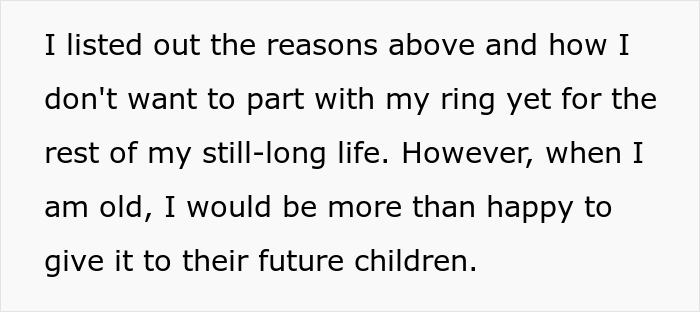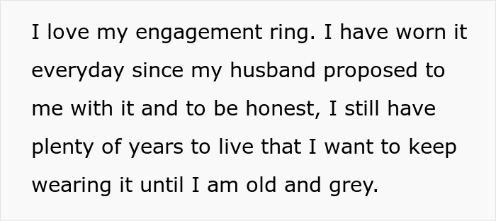 Sam somehow got the idea that he is entitled to his mother’s ring and that this way, he could save a few bucks and not buy a new one. However, the man did not expect his mother would love wearing it so much that she would insist on keeping it. Well, that didn’t sit well with Sam since he continued showing his disapproval of his mother’s actions and started arguing with her. Read on to find out how the whole ordeal unfolded and share your thoughts about it in the comments.