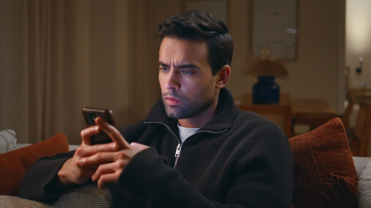 Man sitting on couch in a dark room, looking at his phone with a serious expression, cutting ties with his mother.