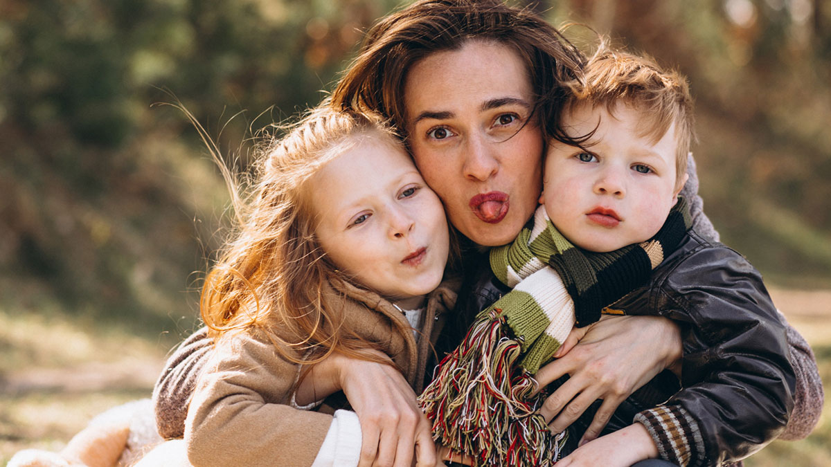 Woman making a funny face hugging two children outdoors, illustrating family dynamics and unruly kids at a wedding.