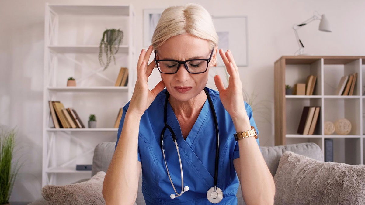 Stressed mom in blue scrubs sitting on couch, holding head, balancing work drama with family and relationships.