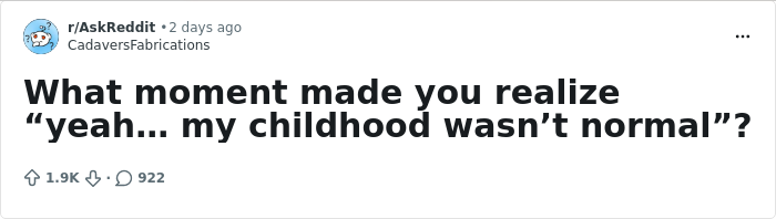 Load More Replies...For me, it was when I started going over to friends' houses to play when I was in elementary school, and I learned that my friends were allowed to close their bedroom doors if they wanted to. I also learned very early on that not everyone's mother was ábusive in every way a parent can be ábusive to a child. Not everyone's mothers took kitchen knives to their dad's arms and back and sliced at them until there was blood everywhere. Not everyone's mothers béat them unconscious or picked them up and threw them into the wall if they "looked like they were about to be bratty". (My mom used to say she could see in my eyes when I was about to be "a brat", so she'd béat me. To this day I have issues making eye contact with anyone.) Not everyone's mothers would press the muzzle of a gún to their chin or head and threaten to unalive them. My mom always told the teachers that I was lying whenever I tried telling a teacher about the béatings and ábuse, so I learned to just... stop talking about it.