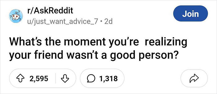 Redditors have recently been recalling times when they realized that a “friend” wasn’t actually who they thought they were, so we’ve gathered some of their most heartbreaking tales below. We sincerely hope that you can’t relate to any of these experiences, pandas. But if you can, remember that you deserve to have amazing friendships and that you can always cut out relationships that aren’t serving you. Keep reading to find a conversation with the user who started this thread, and be sure to upvote the stories that resonate with you.