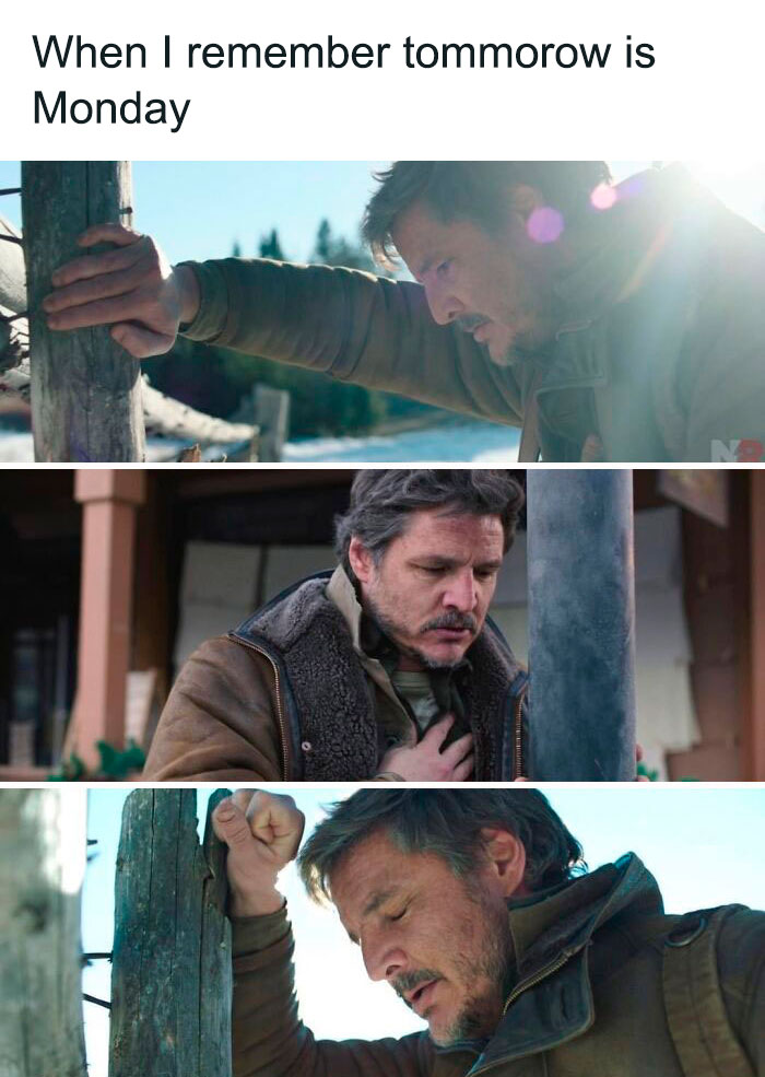 Animated character looking bored in a window and at work, depicting Monday memes for a less miserable day.