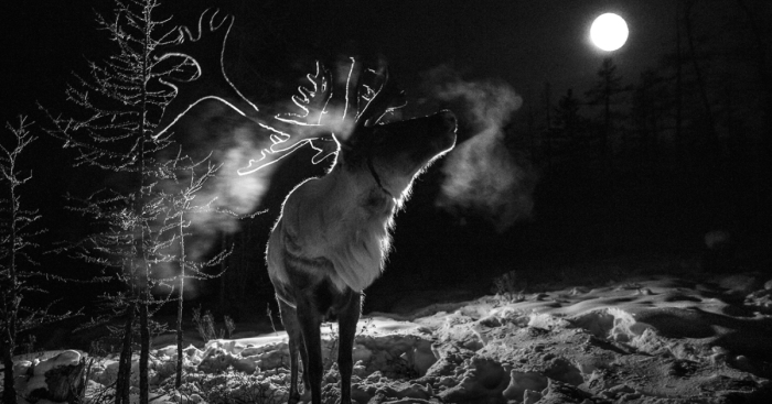 Reindeer during the full moon. Although freed during the day, reindeer are tied in the evening to protect them from wild game