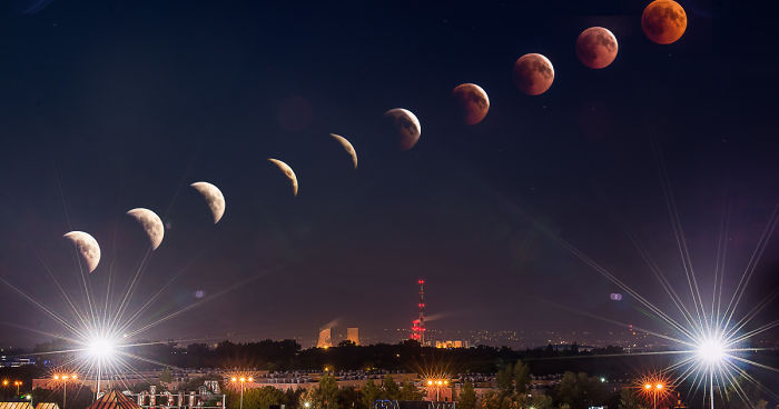 I took this picture by series of photos to show how last moon eclipse looks in every single stage during this magic night in Cracow. 2 hours of standing with my camera to see this unique moment whem earth casts a shadow to the moon.