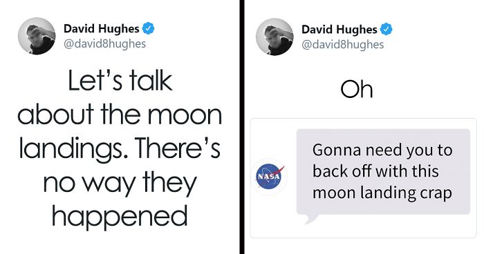 “I decided to do the moon landing tweets because the concept was funny to me, I liked the idea of poking fun at conspiracy theorists by being one of them,” David told Bored Panda.