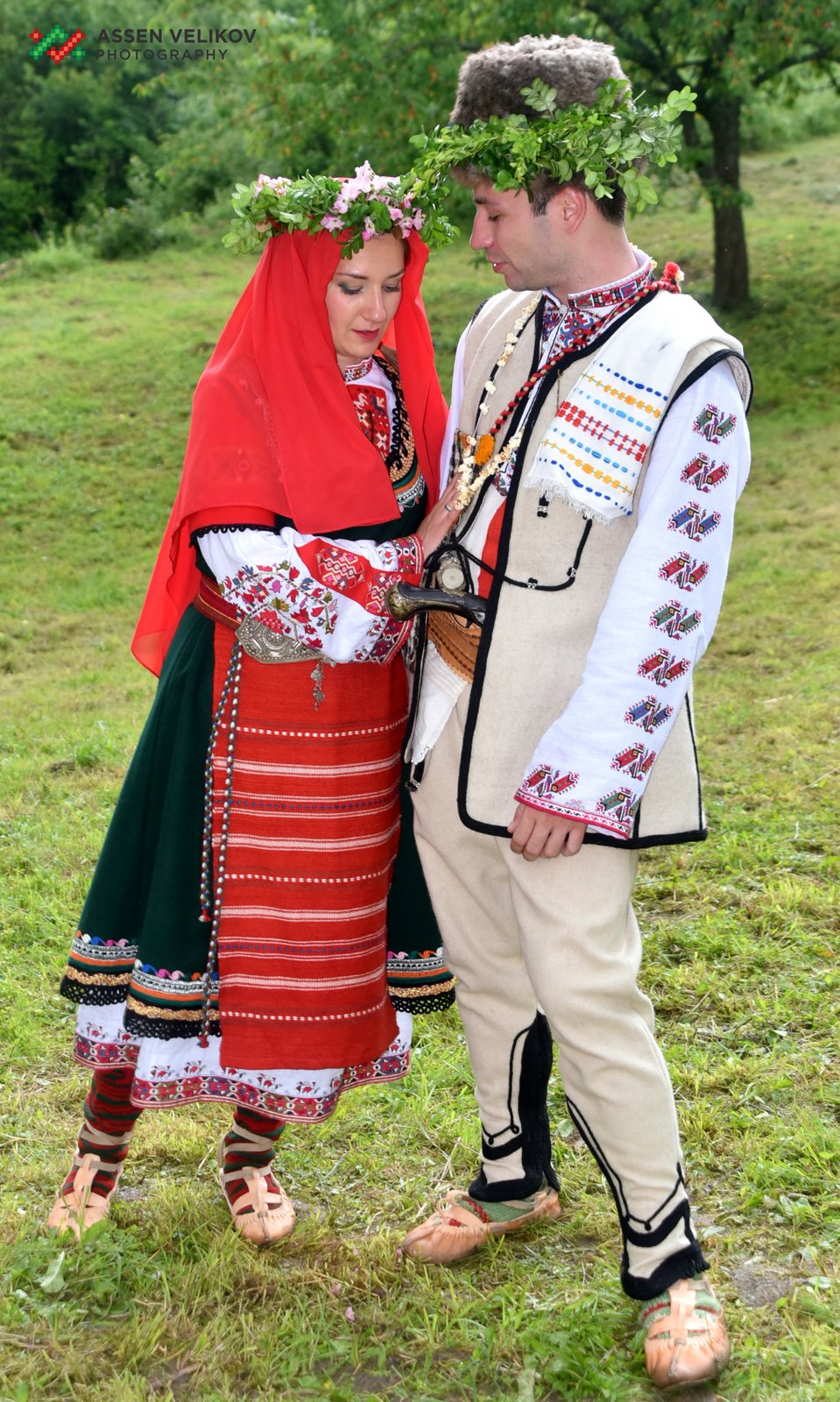 Traditional Bulgarian wedding from the late 18th century. The bride is with red veil in the Orthodox canons of the period. After entering the European culture in the country, the veil becomes white. Besides the red veil, women wore hand-knitted belts with buckles and strings of gold coins that are specific for each of the seven ethnographic regions in Bulgaria. The man wore a belt / silyah / which was holding a bag with money, a knife and a gun.