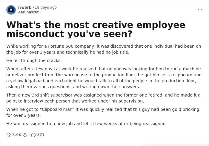 I got in touch with an old school friend of mine. He told me he had been being paid for five years for not working. He started working from home (before covid). He ended up full time WFH because his boss wasn't paying attention. He had a desk at work, but never turned up. Boss moved on. New boss. New hires, etc. Desk obviously got reused. Everyone just forgot about him! Every few months someone questioned the wage for this phantom employee, but no paperwork was found, so it never got stopped. After two years he started a masters degree. After 5 years, someone actually got him made redundant (couldn't sack him). He took his redundancy and started a new job almost immediately with his new qualification. My hero! Five whole years being paid for nothing (a big banking firm, we're not going to see them financially hurt by this).