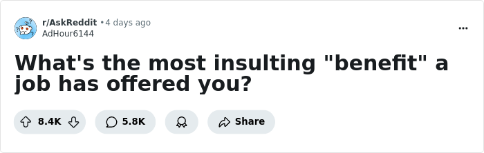 A recent r/AskReddit post by a user who goes by AdHour6144 sparked a conversation about the most insulting job benefits and bonuses employees have ever received.
