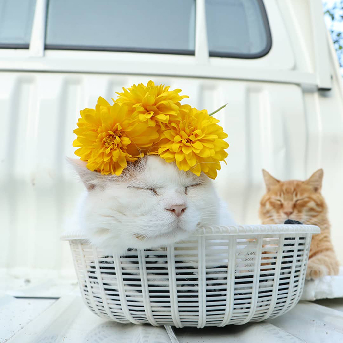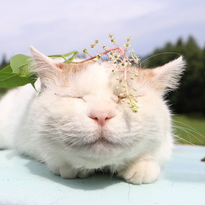 Shiro, a Japanese cat known for his relaxed and chill personality, has sadly passed away at the age of 18 on March 2, 2020. Shiro became famous on social media for his ability to fall asleep no matter when or where—photos of him balancing flowers, fruits, and even frogs on his head while sleeping or relaxing put a smile on the faces of millions of people. Despite the fact that most cats are quite lazy, people on the internet were still often amazed at how chill and Zen Shiro was. No wonder the handsome boy has more than one Instagram account dedicated to him and his flamboyant portraits. Shiro's full name, Shironeko, means "white cat" in Japanese. The "white cat" has led a pretty chill life in Japan alongside his cat siblings and (clearly) loving owners.