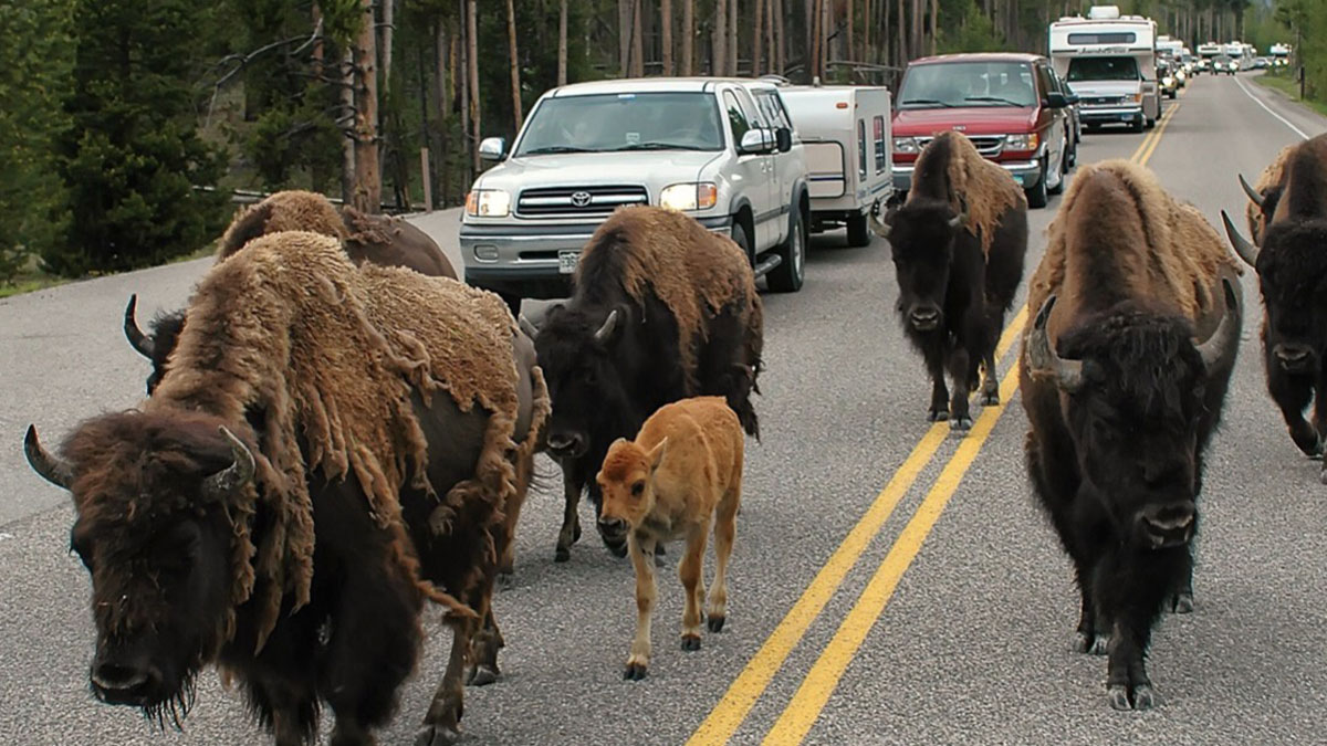 A man got out of his red pickup truck laughing, he made a snowball and hit a huge bison square on the forehead. Still laughing the man jumped back in his truck, and shut the door. The traffic was not moving at all. The bison stared at the closed door of the red truck for about a minute, and then he slowly walked over to the drivers side door. He then slowly head butted the door with his enormous horns, causing severe damage to the truck. You could hear the man screaming profanities through his closed window of the now misshapen truck.