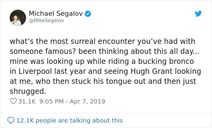We are so used to seeing celebrities on the screen, that sometimes we forget that they are real people. So the experience of meeting somebody famous and getting a glimpse of who they really are can be quite chilling. Sometimes even surreal. Michael Segalov took to Twitter to find out if he's the only who had surreal encounters with celebrities. Turns out he isn't. His tweet went viral and people began sharing their own thrilling experiences. Scroll below to read them!