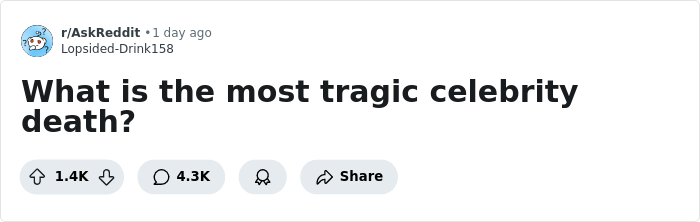 As it happens, Redditors recently reflected on other celebrity deaths that struck a similar chord. Their stories moved us to put together a list of their choices as a tribute. Read them below, and let’s honor their legacies together.