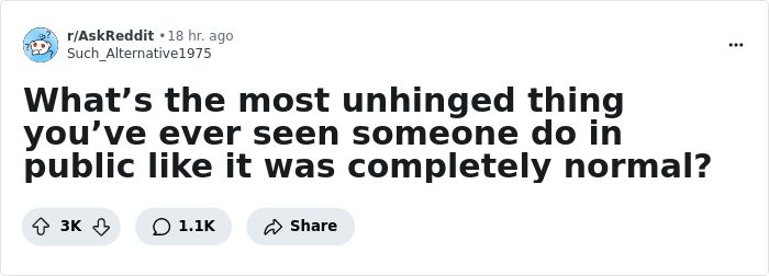 It all started, as often happens, in the AskReddit community, where a couple of days ago the user u/Such_Alternative1975 asked the question: "What’s the most unhinged thing you’ve ever seen someone do in public like it was completely normal?"