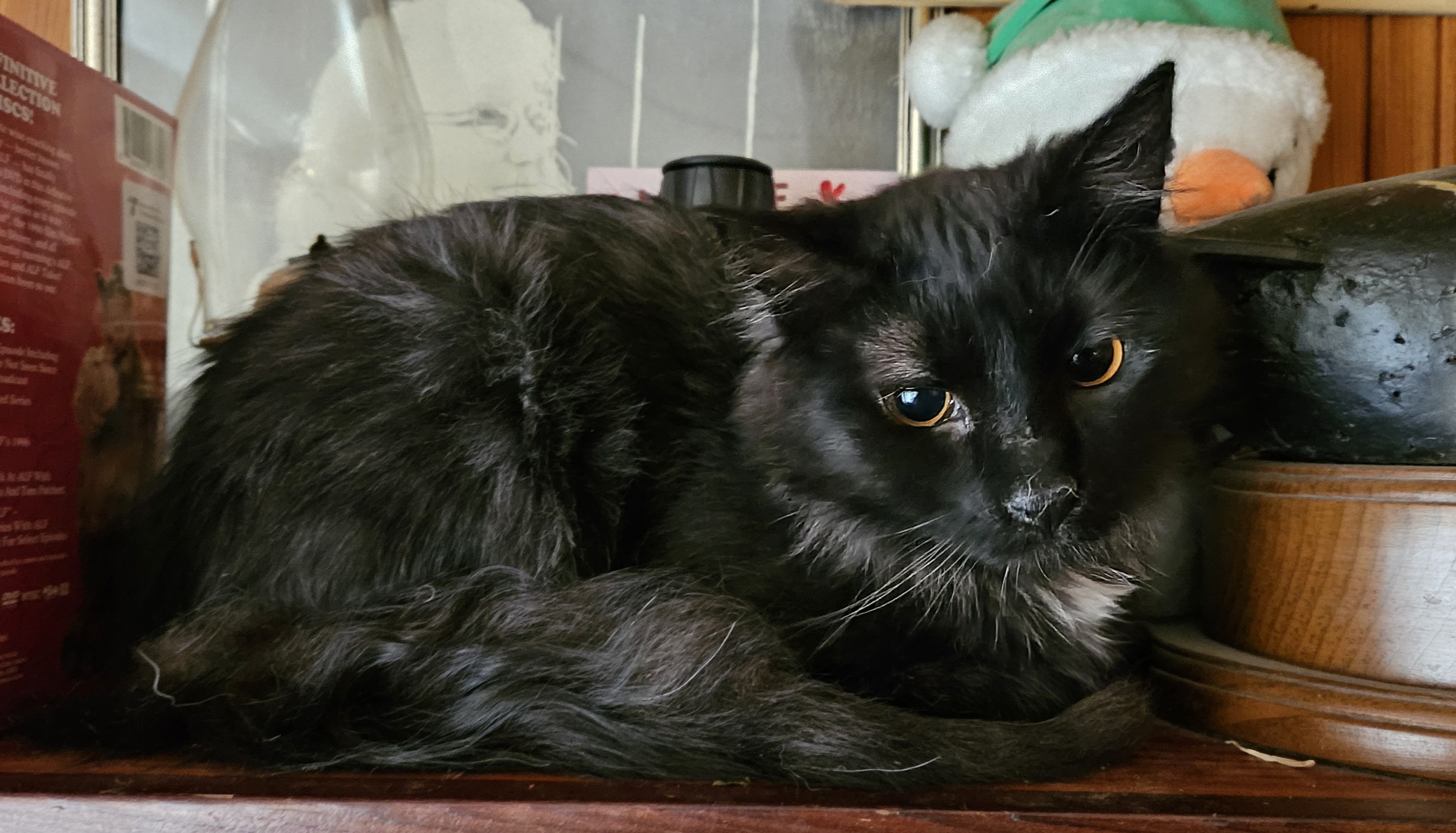 CDS - Cat distro system at work. I lost my 18 year old house panther in March (on my birthday no less) and two weeks later during a rain storm, I came home, opened my door and a flash shot under my feet. A black, soaked, matted 6 month old (according to the vet) kitten who immediately found a place near the heat and fell asleep. Wife fell in love with him. After vet visits, vaxxes etc, having him shaved of his terrible matting and neutering, I now have a 9 month old terror demon that is a lovebug until the switch flips! LOL! Meet "Shadow!" 20250531_1...3481e7.jpg