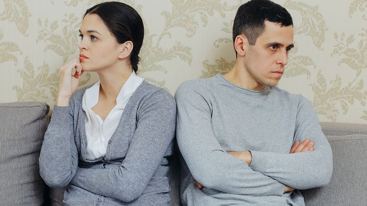 Wife and lazy hubby sitting apart on couch, wife upset and husband avoiding chores after inviting mom to help.